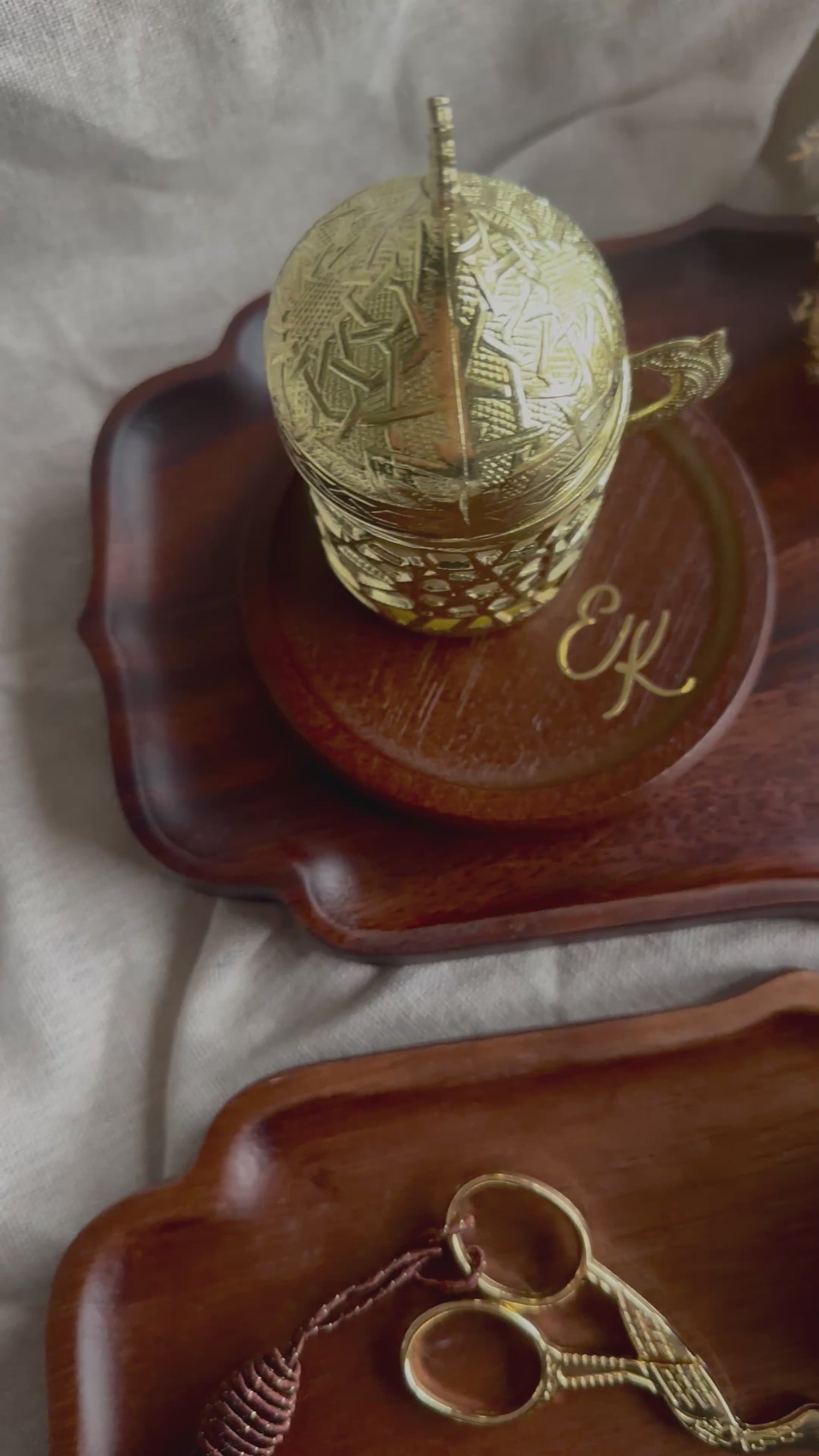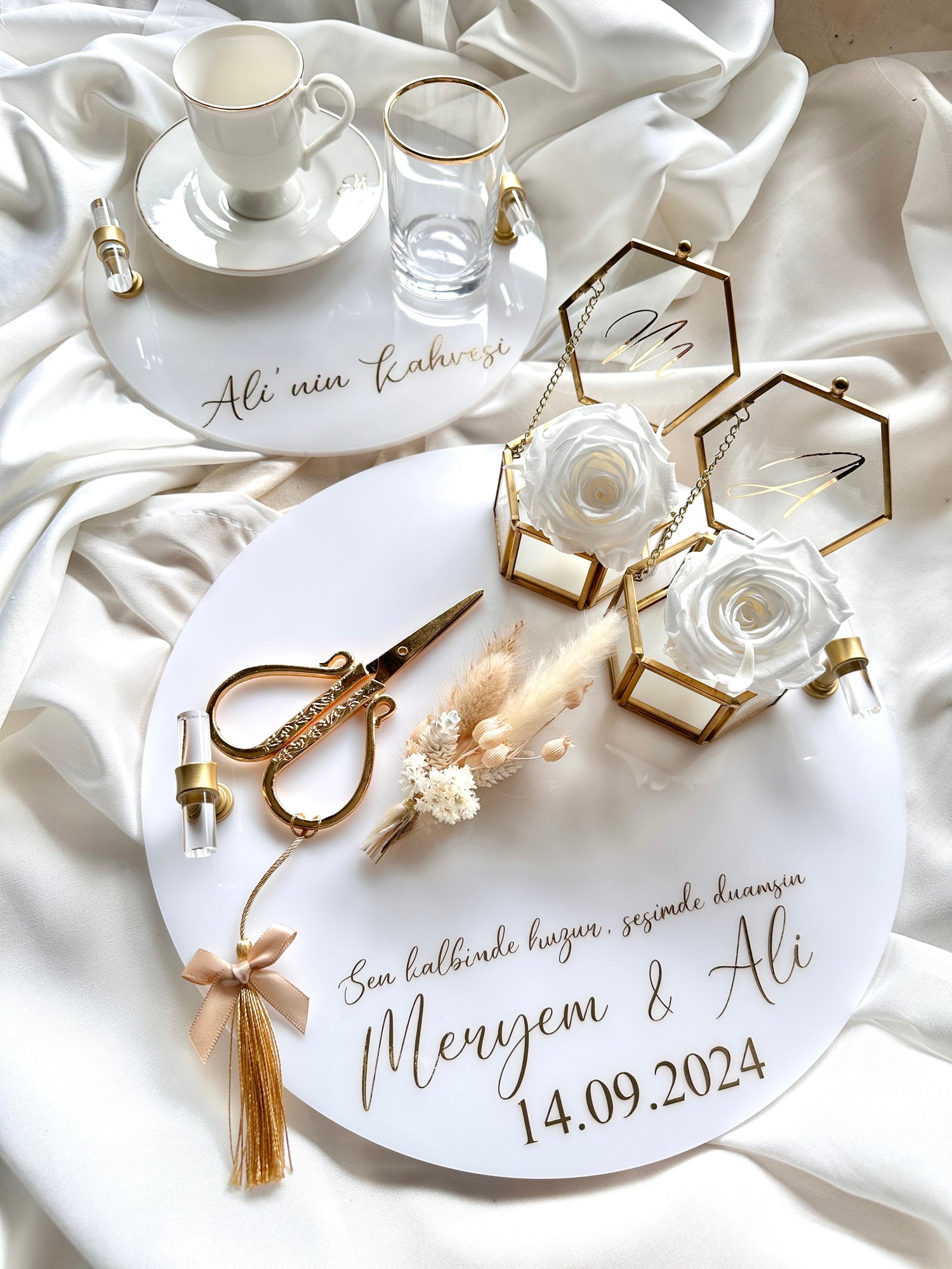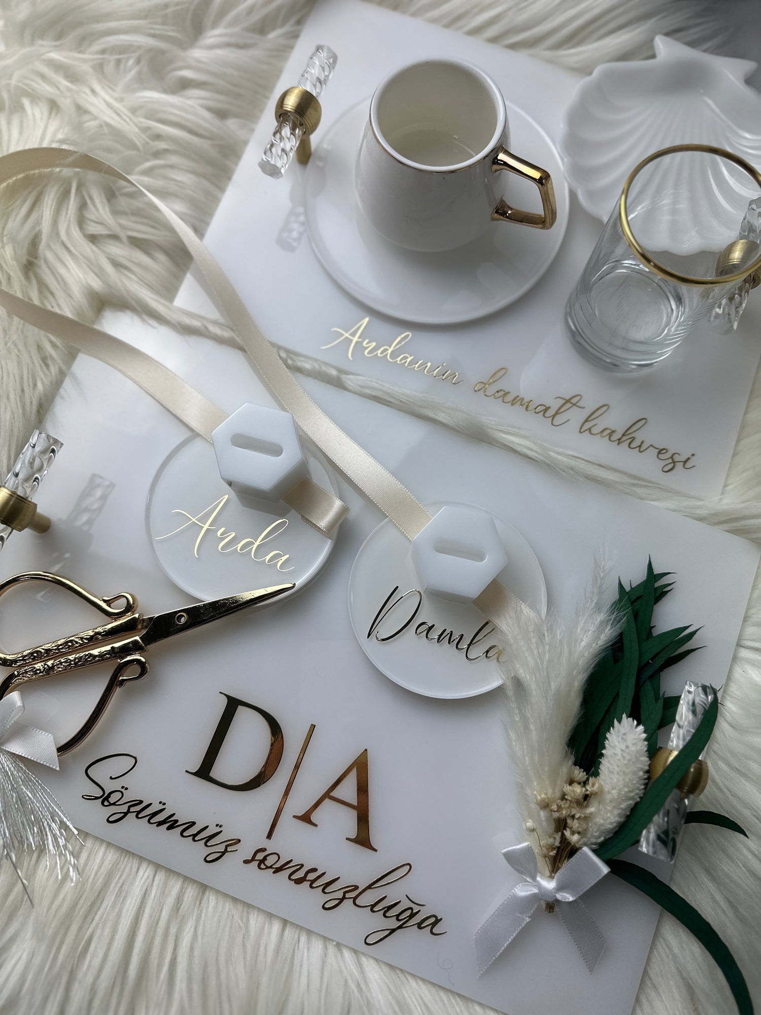 Hochwertige Premiumacryl Tabletts für deine Verlobung. Wahlweise mit goldenen oder silbernen Griffen.
