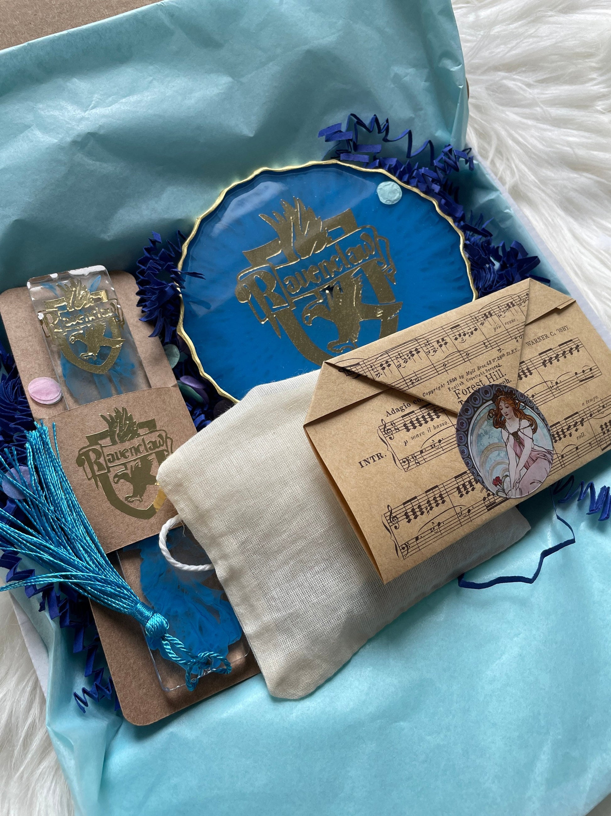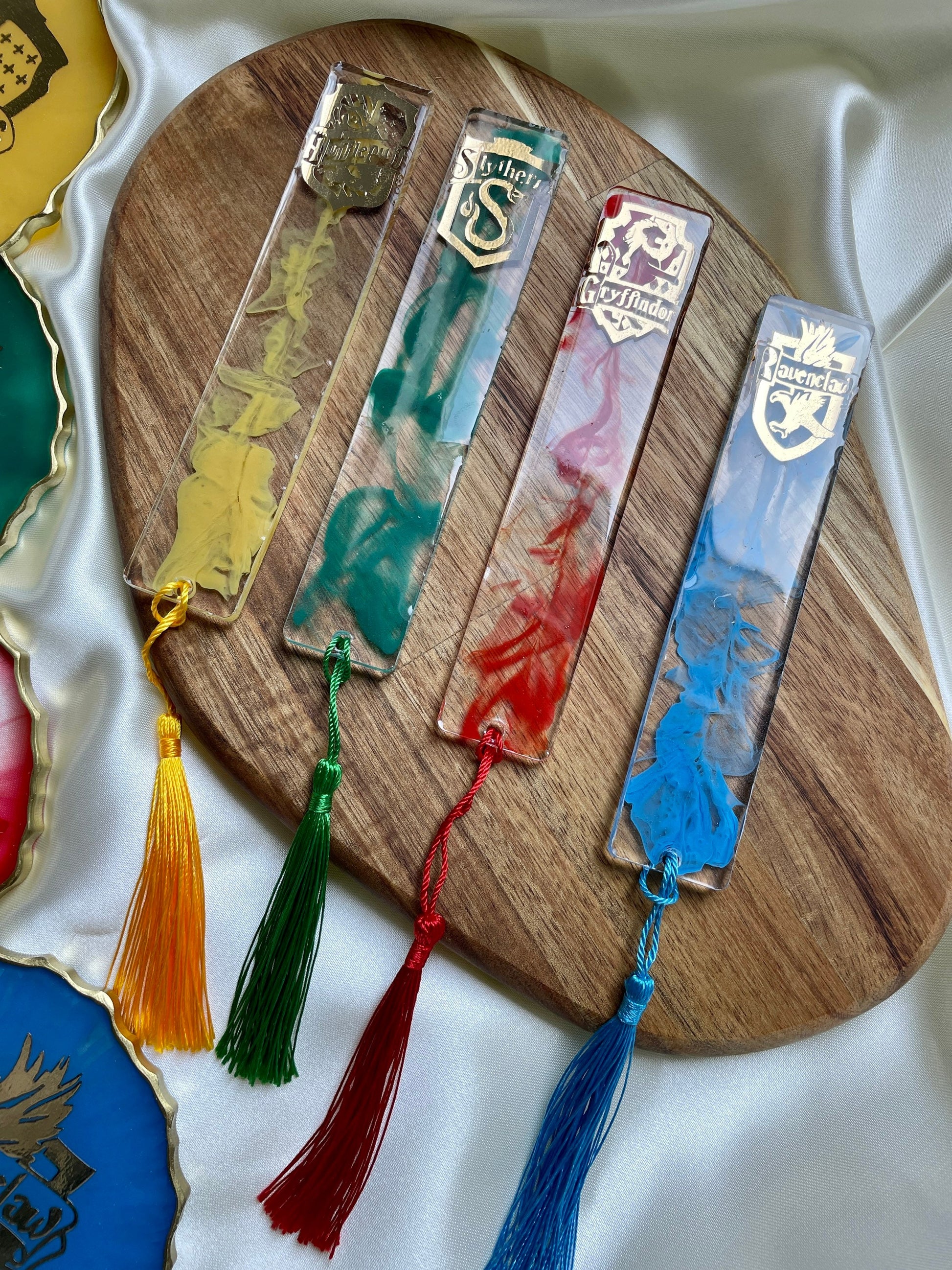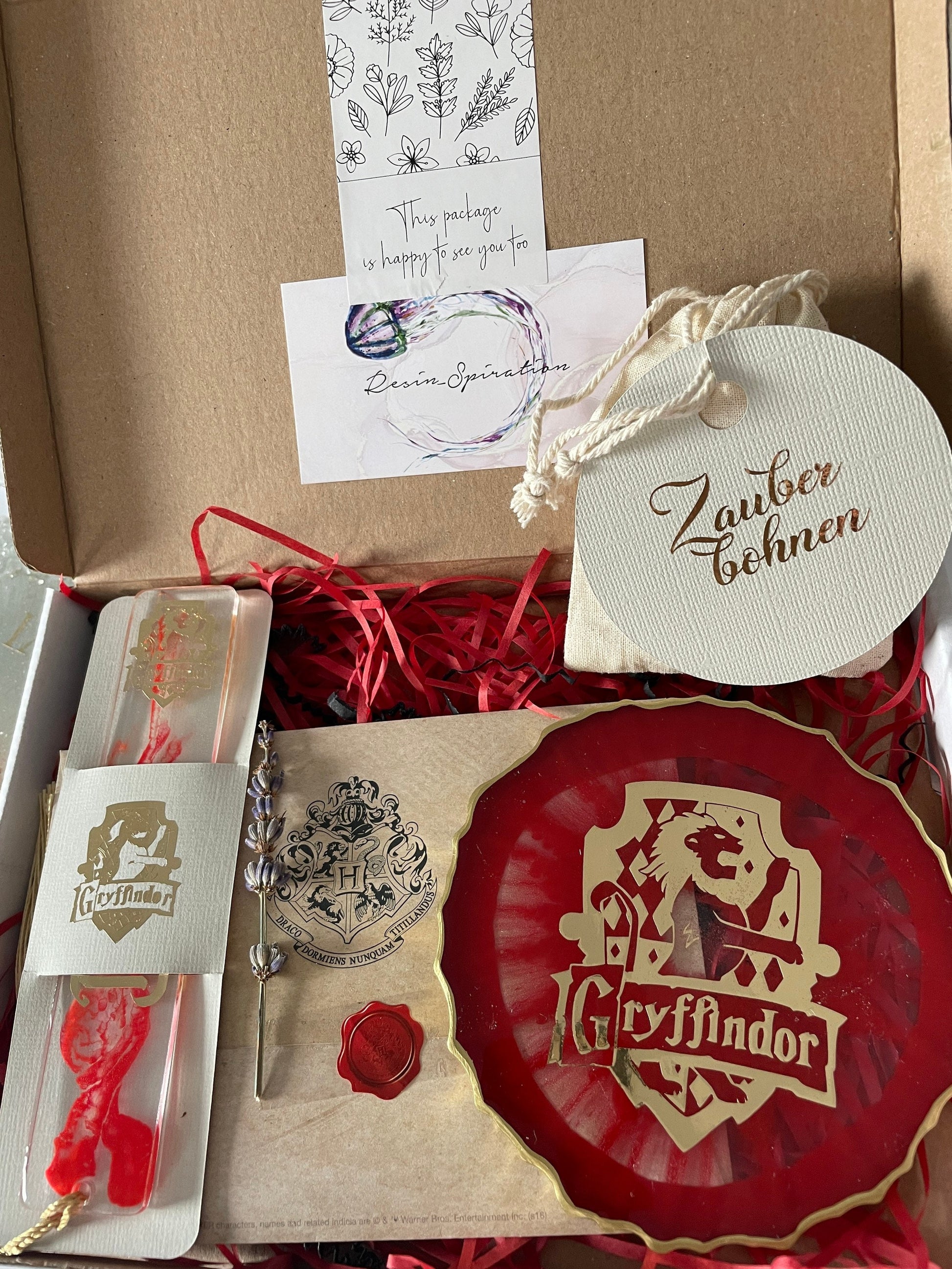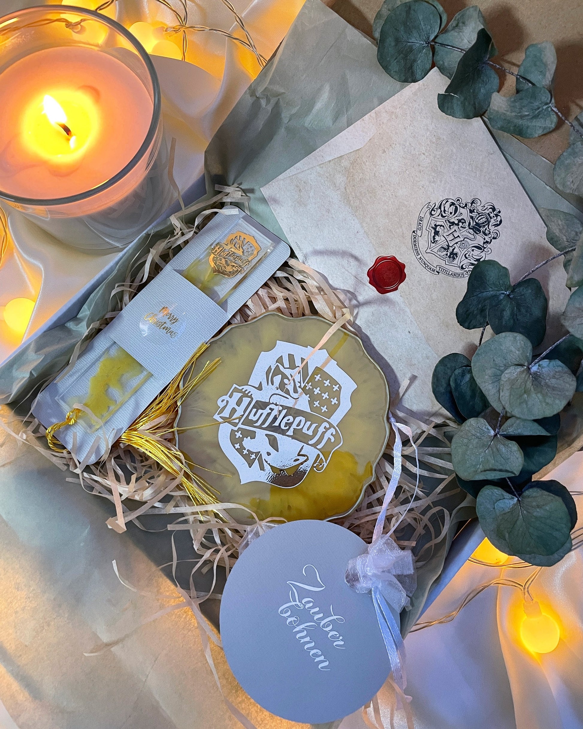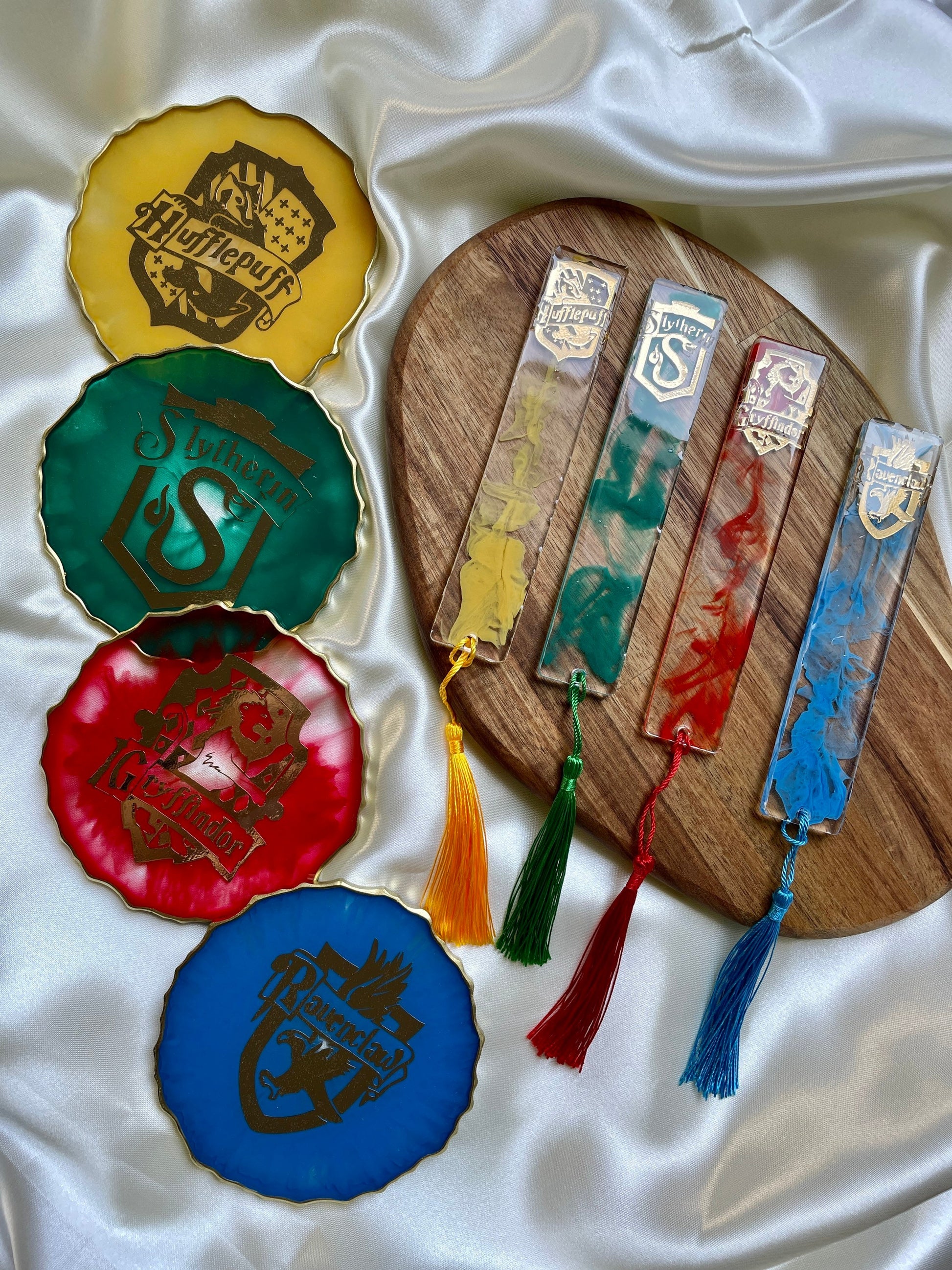 Untersetzer und Lesezeichen mit den berühmten Harry Potter Häusern.