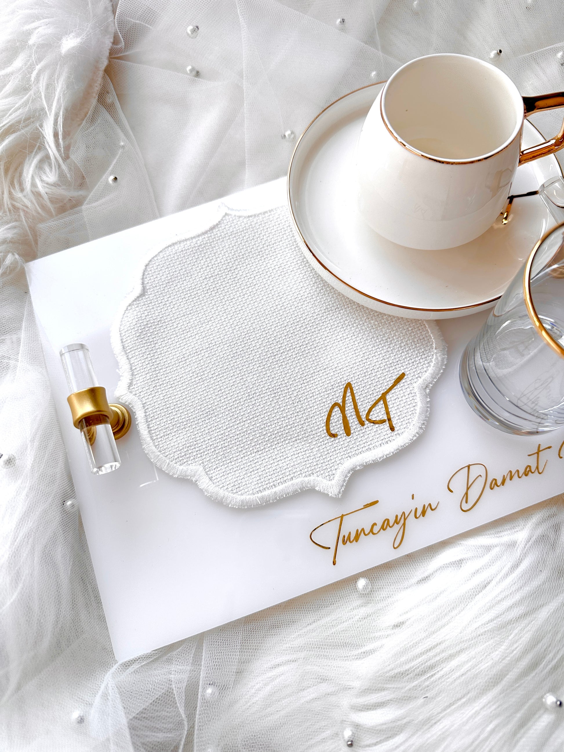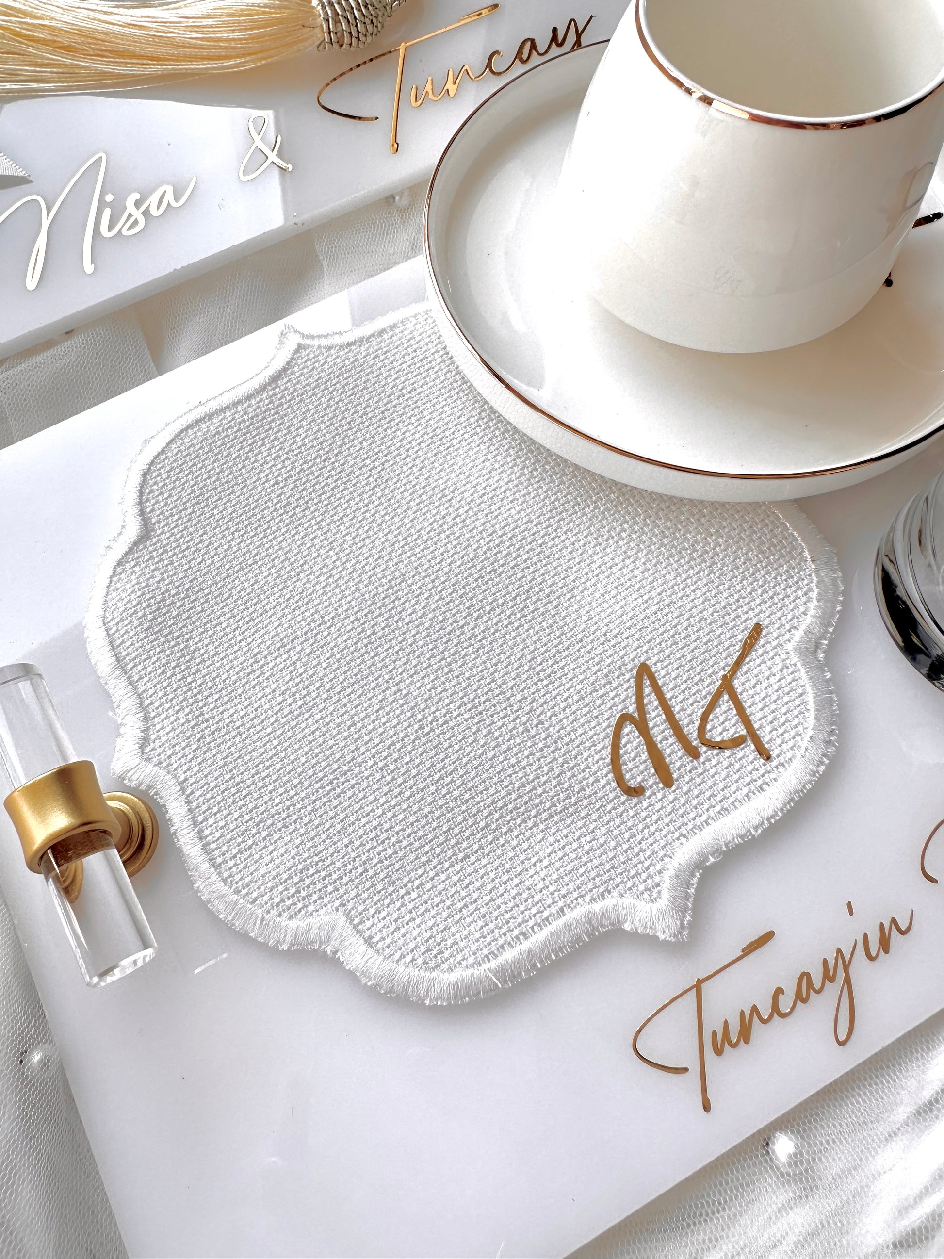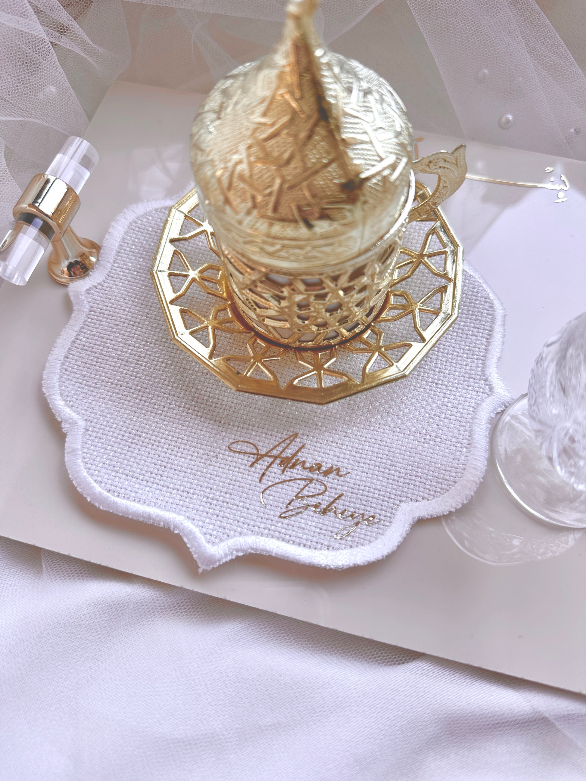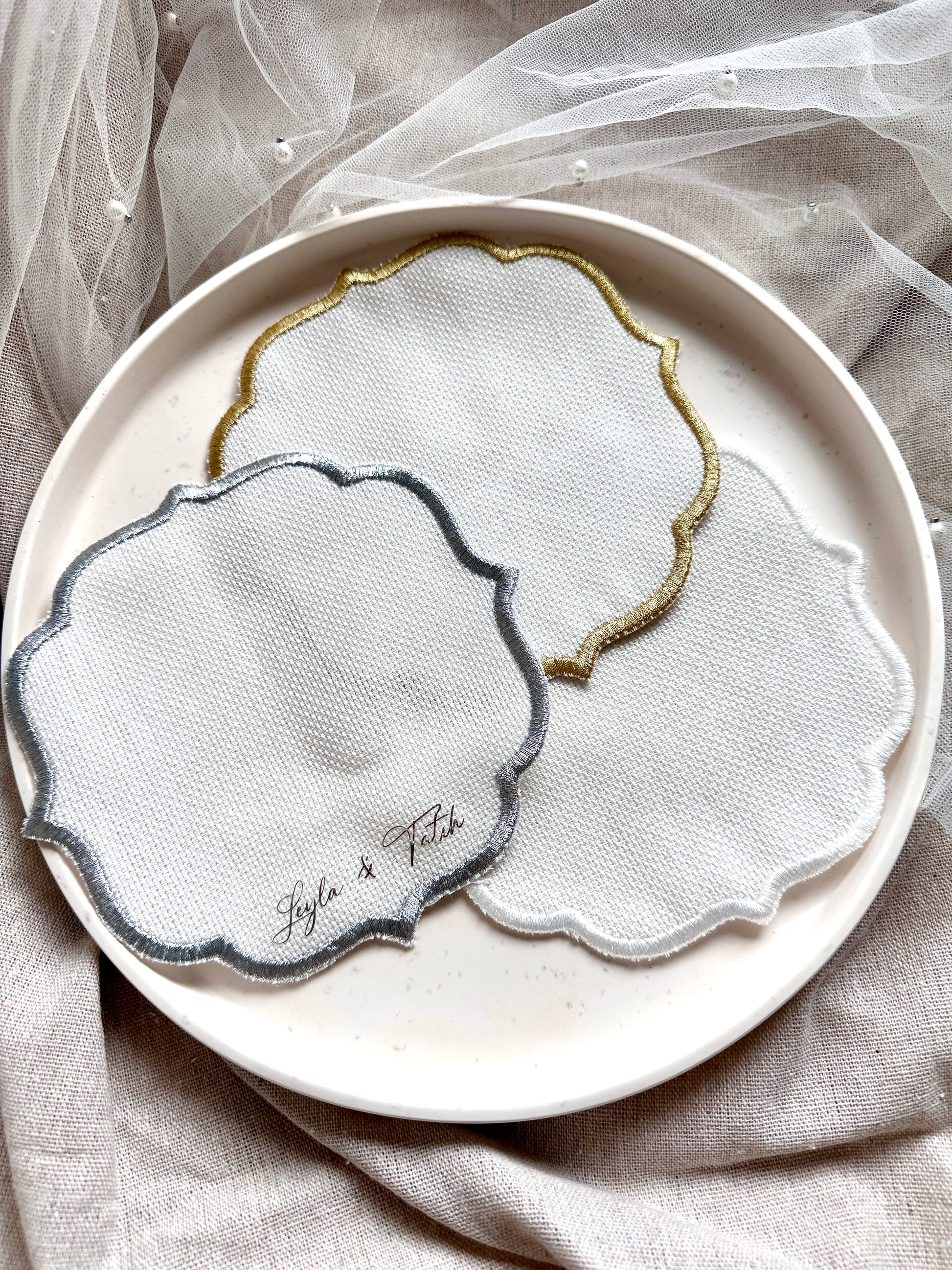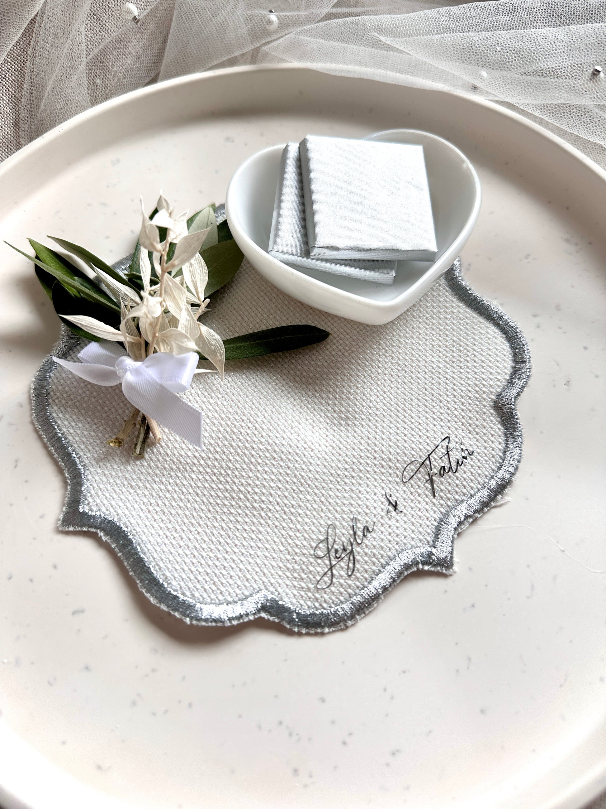 Personalisierter Stoffuntersetzer für deine Verlobung.